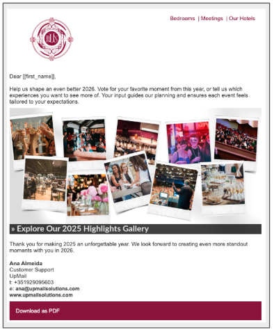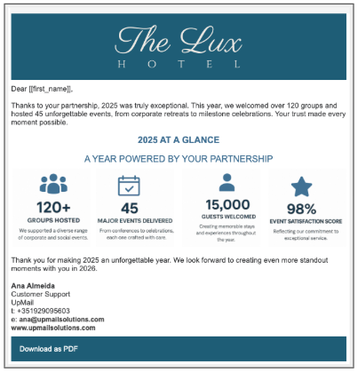 Streamline your hotel event servicing with UpMail’s ready-to-use templates. From pre-event communication to post-event follow-ups, ensure consistent, professional, and efficient client interactions that build trust and encourage repeat business.