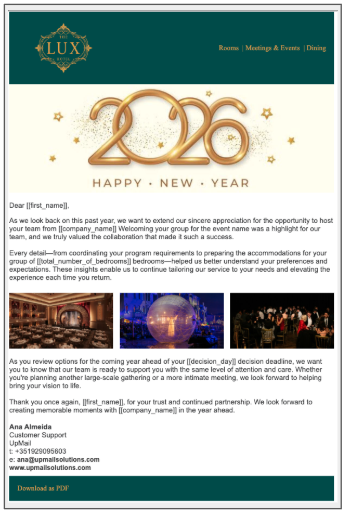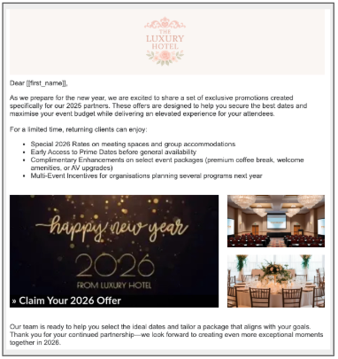 Year-end emails are the perfect opportunity to subtly encourage bookings for the next year. Consider including: