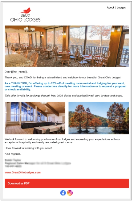 Highlight what’s new at your property: renovated meeting spaces, seasonal packages, or special promotions. A well-crafted email showcasing these updates can reignite interest without being pushy.
