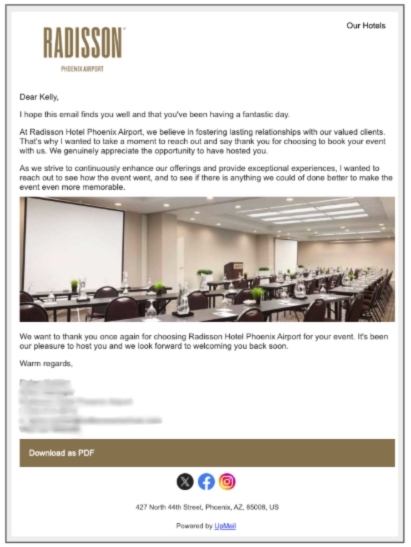 Streamline your hotel event servicing with UpMail’s ready-to-use templates. From pre-event communication to post-event follow-ups, ensure consistent, professional, and efficient client interactions that build trust and encourage repeat business.